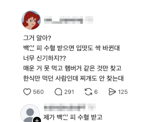 백인 피 수혈받으면 입맛이 싹 바뀐대