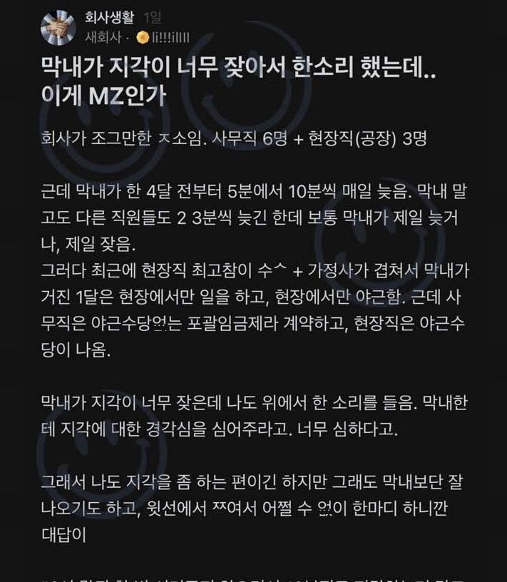 ㅈ소 회사 막내가 지각이 너무 잦아서 한소리 했는데..