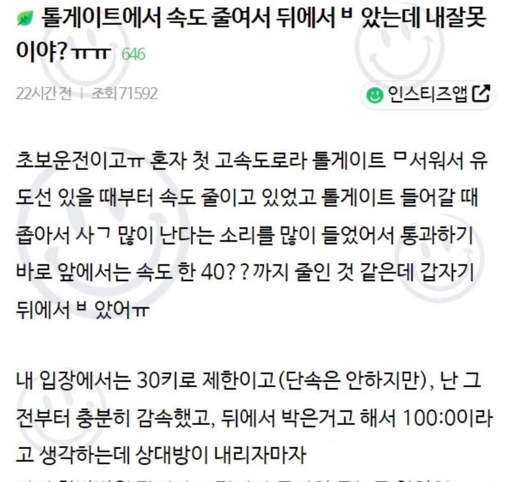 톨게이트에서 속도 줄여서 뒤에서 ㅂ았는데 내잘못이야?ㅠ...