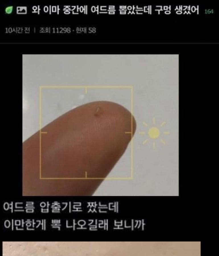 와 이마 중간에 여드름 뽑았는데 구멍 생겼어 ㄷㄷ