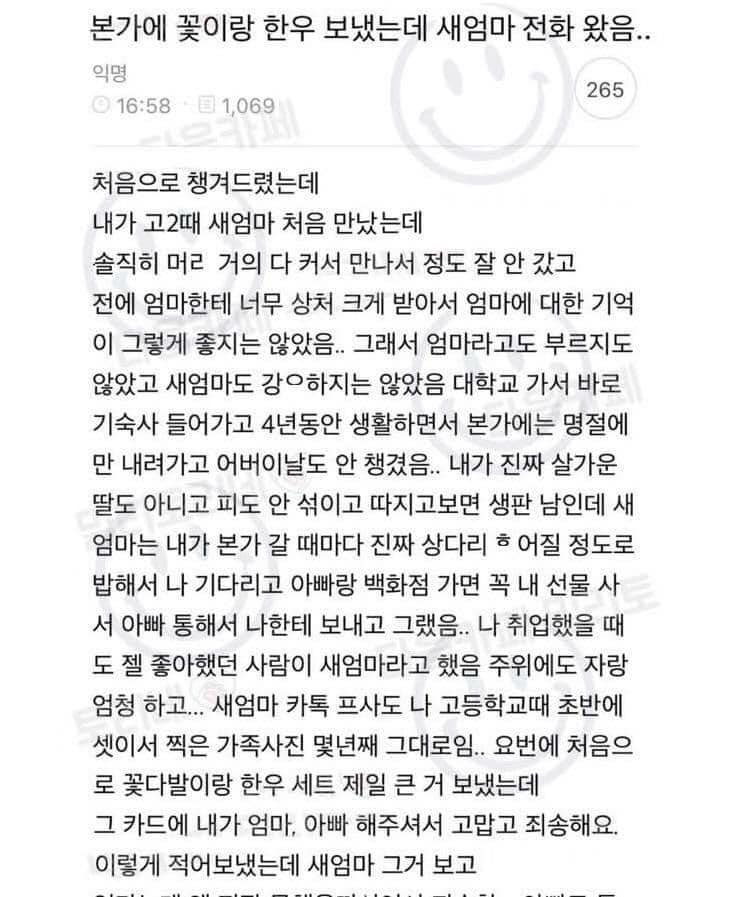 본가에 꽃이랑 한우 보냈는데 새엄마 전화 왔음..