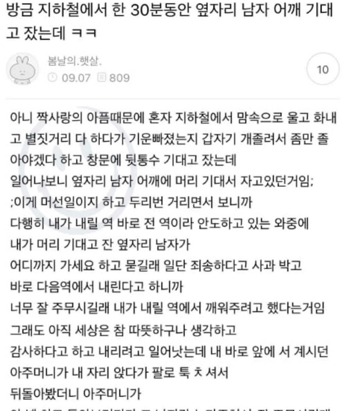 방금 지하철에서 옆자리 남자 어깨에 기대고 잤는데..